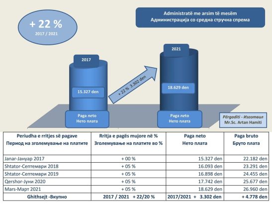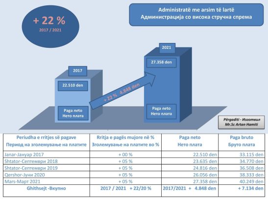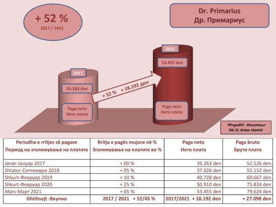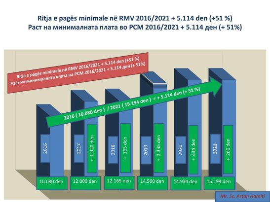 Ne lidhje me disa statistika dhe të dhëna të cilat i kam pergaditur nga burime tepër të sakta i bie q? periudha 2016/2021 ka qenë një nga periudhat më të suksesshme që nga pavarsimi i RMV, sa i perket rritjes se pagës minimale në RMV, për arsye se paga minimale nga periudha 2016 / 2021 ka shënuar ritje prej 51 % apo 5.114 den edhe atë: