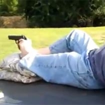 Në videon e postuar në YouTube, shihet Michael i shtrirë mbi automobil, duke mbajtur revolen me gishta të këmbës, duke e mbushur, karikuar dhe duke qëlluar saktë në shenjë.