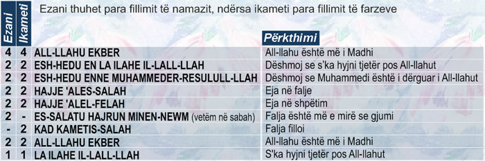| Salavat | All-llahumme barik ‘ala Muhammedin We ‘ala ali Muhammed Kema barekte ‘ala Ibrahime we ‘ala ali Ibrahim Inneke hamidun mexhid | O All-llahu im, begatoje Muhammedin dhe familjen e tij, siç e begatove Ibrahimin dhe familjen e tij, Ti je i Falënderuar dhe i Lartësuar |