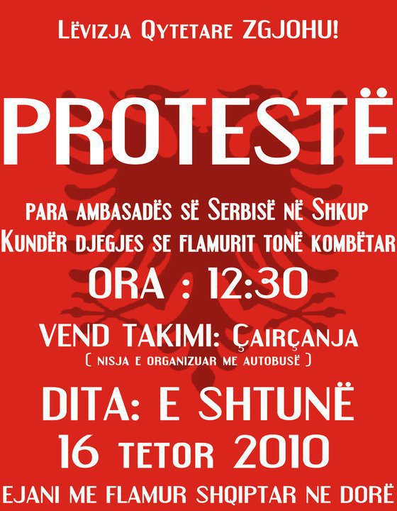 Duke dënuar ksenofobinë serbe të shfaqur nëpërmjet djegies së flamurit shqiptar, Lëvizja Qytetare Zgjohu planifikon që të protestojë para ambasadës së Serbisë në Shkup. “Lëvizja Zgjohu! fton organizatat brenda forumit tonë të shoqërisë civile që bashkërisht të shqyrtojmë mundësinë e organizimit të protestës para ambasadës së Serbisë në Shkup, kundër kësaj shprehjeje të urrejtjes ndaj popullit autokton shqiptar dhe fton të gjitha partitë politike shqiptare, intelektualët dhe mediat që të bashkëngjiten në ngritjen e zërit kundër ksenofobisë serbe”, tha kryetari i Zgjohu-t, Artan Grubi. Lëvizja Qytetare Zgjohu dënon ashpër ksenofobinë serbe të shfaqur nëpërmjet djegies së flamurit kombëtar shqiptar nga huliganët serb në shkallët e stadiumit “Marassi” në Genoa të Italisë ku po luhej ndeshja midis kombëtarëve të Italisë dhe Serbisë. “Shprehjet fashizoide kundër shqiptarëve, Kosovës dhe djegia e flamurit kombëtar të shqiptarëve shfaq barbarinë serbe që akoma nuk ka evoluar në hap me civilizimin botëror dhe rikthehet në sjelljet shtazarake të paraardhësve të tyre nga shekulli i VII gjatë dyndjes së popujve sllav në Ballkan dhe shkatërrimit të civilizimit ilir në këto troje”, thuhet në reagimin e Zgjohu-t.